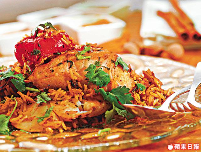 石斑柳1公斤(切細件)、牛油2湯匙、蒜茸2茶匙、洋葱1個(切碎)、中東雜香草3茶匙、去皮番茄11/2杯(切碎)、鹽2茶匙、黑胡椒碎少許、紅花粉/番荽碎/芫荽碎各1茶匙、水21/2杯、印度米2杯