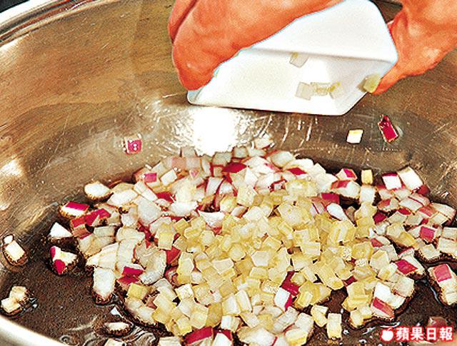 3.燒熱鑊下牛油,爆香蒜茸及洋葱,加入菠菜拌勻盛起,攤凉備用。