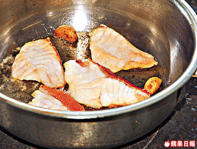 1.燒熱鍋下牛油爆香蒜茸,下石斑件,以中火煮5分鐘盛起備用。