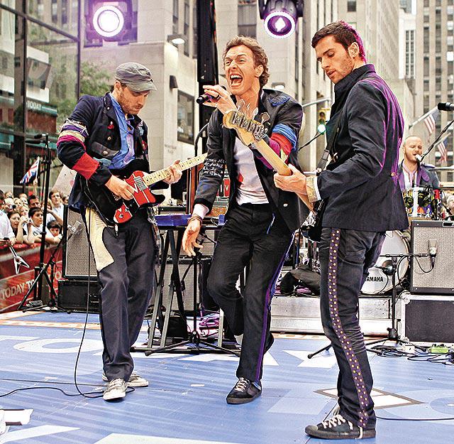 英國人氣樂隊Coldplay昨日在紐約為NBC的TodayShow演出,宣傳他們勇奪美國Billboard流行榜冠軍的最新大碟《VivaLaVida》。當他們出場時,圍觀的女fans立即陷入瘋狂狀態,不斷尖叫,更有人趁機將一個香艷的粉紫色胸圍拋上台,掟中主音ChrisMartin塊面,引起全場哄動。