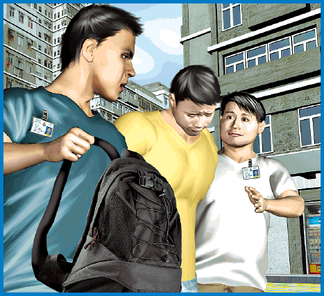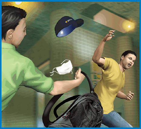 當時正在下雨,兩人追逐至附近一條梯級發生糾纏,混亂中賊人兩支螺絲批跌在地上,但他仍能擺脫糾纏繼續逃走。事主再追了一段路,再度擒住賊人,兩人又起打鬥,扭作一團。混亂中,賊人背囊被扯脫,袋內的現金和相機等贓物散落地上,賊人所戴鴨舌帽和口罩亦告脫落,但他最後成功向附近山上逃去。