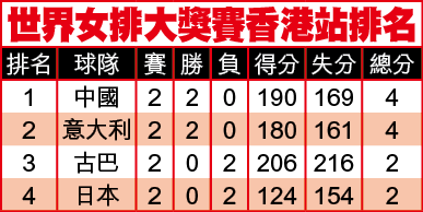 中國女排在紅館的世界女排大獎賽香港站上演的復仇之戰,在全場爆滿的一萬多名球迷傾力打氣下,越戰越強;繼前天擊敗古巴後,昨日只花了72分鐘,便以3:0擊敗日本,今午與同樣兩戰兩勝的意大利爭奪此站冠軍之餘,冀能挽回去年在同一場地敗陣之恥。(無綫翡翠台今日1:15pm直播)