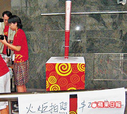 大會從香港男排隊長余慶龍借來奧運火炬,放在場外供市民拍照(圖)。最低消費只不過$20,就可以同火炬影相,同時又可以賑災,何樂而不為呢!