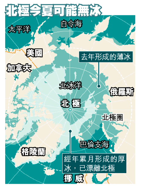 氣候暖化問題,在這個夏天,有可能造成另一個可怕景象──北極歷來首度變成無冰世界。科學家指現時覆蓋北極的,只有在去年形成的薄冰。今年9月前,薄冰有可能全部融化。
