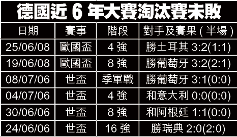 德國打法或者不及西班牙悅目,但就穩陣得多,自02世盃決賽以0:2不敵巴西後,於大賽的淘汰賽法定時間已連續6年未輸過。