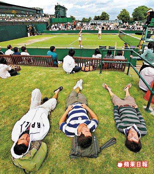不知道是因為賽事太悶還是疲倦,這三位球迷寧願安躺在場邊小休,也不觀看場內進行中的女雙賽事。路透社