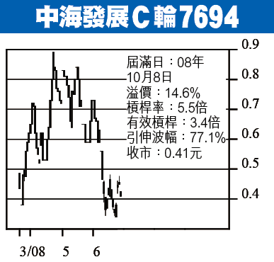 中海發展C輪7694:中海發展(1138)上周五收22.6元,跌1.5%,但近排股價第3次守穩250日線回升,短線可以試23.5至25元,買少少7694博短線,隻輪收41仙,有效槓桿3.4倍。正股升上25元,7694可見57仙,正股跌穿21元就沽咗隻輪止蝕。