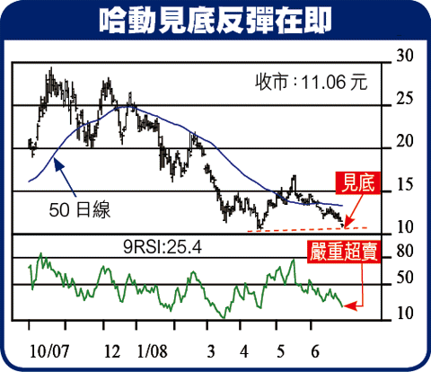 上次推介後,哈動扶搖直上,短短一個月內,升至16.86元,大漲57%。今回由10.90元起步,即使以黃金比率彈幅0.382倍推算,也可進至13.18元,升幅19%。