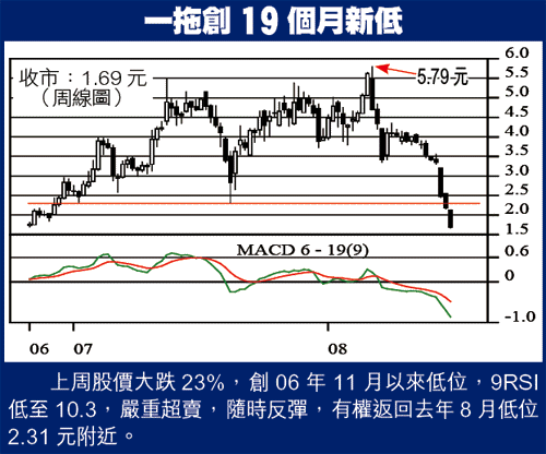一拖夠殘,殘在率先跌穿去年8月17日所創52周低位2.31元,上周插至1.67元,偏離幅度達27.7%。H股指數上周五雖低至11647,比52周低位10253,仍高出13%,可見一拖低殘程度。