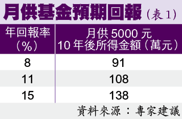 建議將餘下每月2500元平均投資於景順亞洲棟樑基金和DWS環球神農基金。如上述4隻基金的每年投資平均回報達11%,按每月5000元的投資計算,10年後便可獲得108萬元,剛能滿足王小姐成為百萬富婆的心願(表1)。