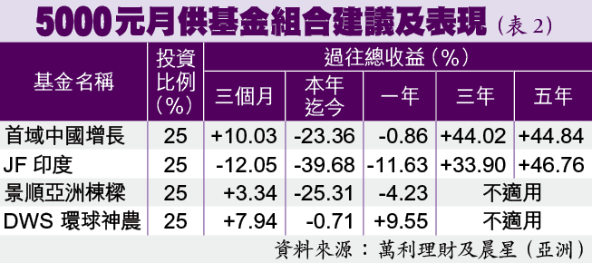 現時巿況雖較為低沉,印度SENSEX指數由年初至今下跌逾三成,但正好運用每月供款,分小注吸納,以收「平均成本法」之效,估計每5年的回報可達1倍之多。建議用一半資金即每月2500元,平均投資於首域中國增長基金和JF印度基金。