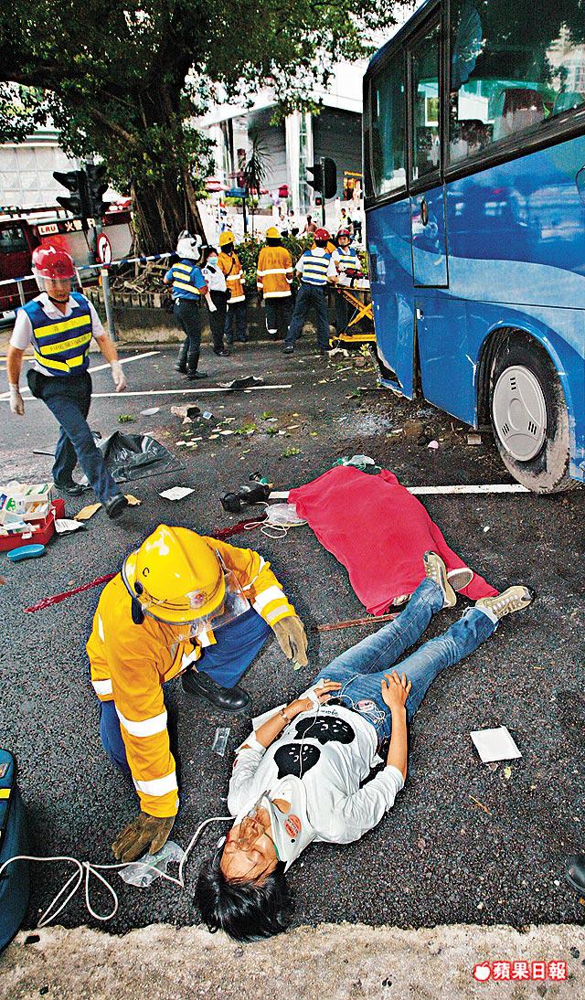 【本報訊】港島中區花園道昨日下午發生大車禍。載着屯門一個屋苑60名街坊的旅遊巴,落斜途中司機大喊「冇腳掣」,全車失控如過山車般俯衝,連撞八輛的士和私家車,繼而衝向下亞厘畢道,撞倒一名站在安全島的13歲女學生及一名女途人,直至撼向政府總部大樓外牆始停下,女童當場斃命。車禍中共32人受傷,其中兩人情況嚴重。 記者:鄭大康、卓永強
