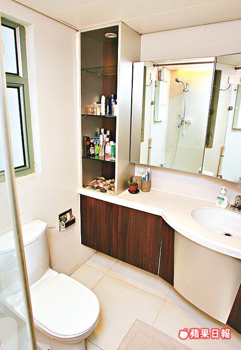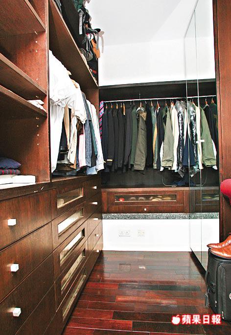 其實兩間睡房合併的部份不多,只是拆去細房部份牆身,封掉窗台,建抽屜及掛通,自製衣帽間,原有大房門位移出,納入浴室成套房格局,寢區床頭建軟墊布板,側旁書桌部份延伸至窗台上,增加實用性。