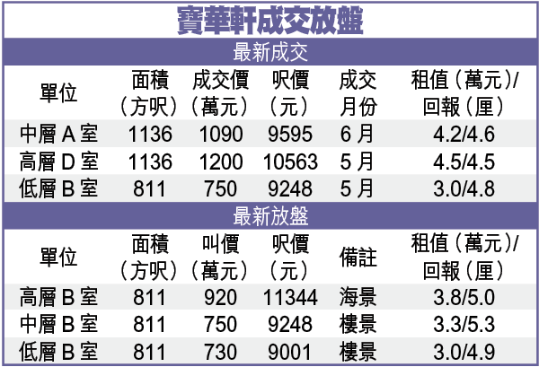 利嘉閣陳偉心表示,寶華軒屬區內較新物業,受市場追捧,每月有1至2宗成交,即使全廈最高價的頂層自製複式單位,亦具承接力,著名投資者黎汝遠,今年1月以4680萬元買入,4月以5028萬元轉售,以單位面積3882方呎計,成交呎價12952元,持貨3個月賺348萬元,幅度7.4%。