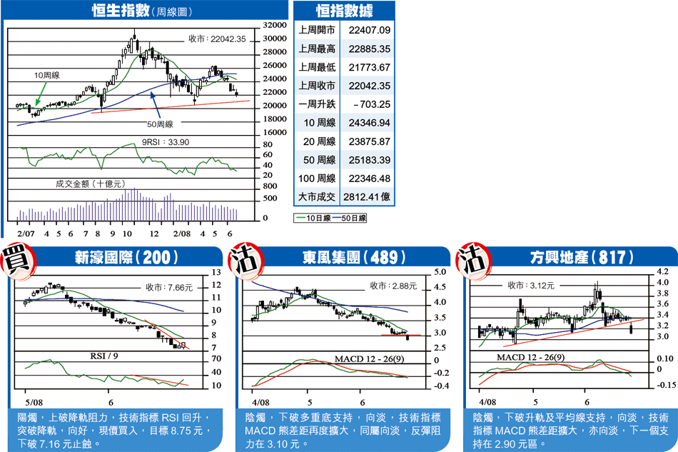 周線圖所見,十字胎過後,繼續其尋底之旅,緩升急挫的走勢仍然不變,可見人心之虛怯。只是大市由26000以上下滑至今,並沒有出現似樣的反彈,加上逼近主要支持區,今周將會出現反彈,關鍵在於反彈幅度,會否像之前一樣,只是形式上的,重複急挫緩升的格局。另外,成交萎縮才是後市最大隱憂,成交一日未能回升,大市一日未能確認見底。