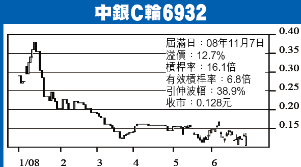 ■中銀C輪6932收0.128元,跌0.003元,成交37球。此輪08年11月7日到期,行使價21.888元,溢價12.7%,槓桿率16.1倍,有效6.8倍,引伸波幅38.9%,街貨0.6%。正股見22元,此輪轉回價內兼槓桿率較高,理論價0.199元,升55%。