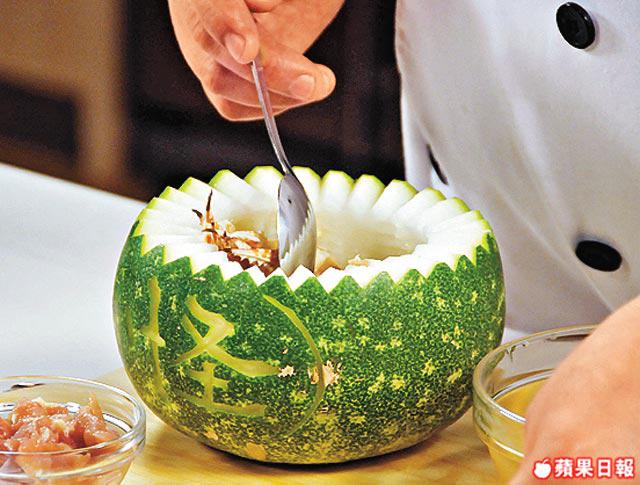 挖冬瓜,最好只挖走中間的瓤,以免挖走太多瓜肉。在瓜面雕花時,記得只能凹雕,不能凸雕,否則沒皮撐住,蒸好的冬瓜肉會收縮皺皮,賣相大打折扣。