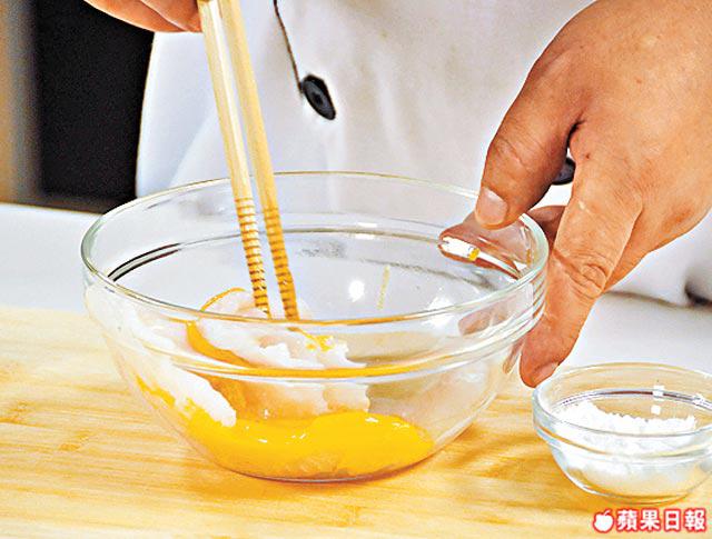 1.雞蛋加夜香花、鹽及胡椒粉後拂勻。