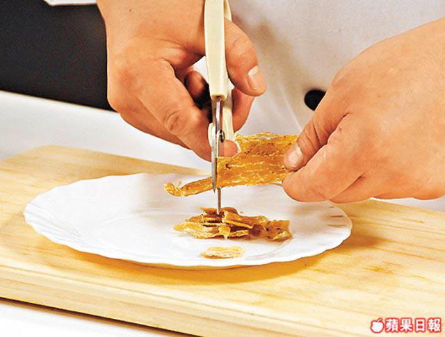 1.大地魚切成方塊,下油鑊炸脆後撈起。