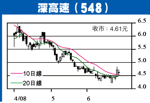 近期較多留意公路股,其中深高速(548)近日走勢一度出現大成交突破,升破10日及20日線,短線走勢似已築底成功。