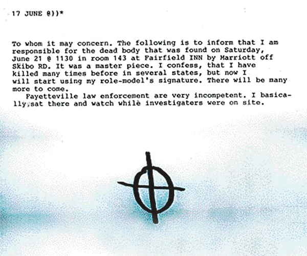 「黃道帶殺手」是美國史上的高智能殺手,1960年代尾,曾在加州殺害至少五人,殺人後又寄信給傳媒,揚言殺死了逾30人,並在信中留下圓圈加十字架的神秘符號,成為美國史上最大懸案之一。事隔40多年後,這個令人震慄的符號,再度在北卡州中部城市費耶特訥斯(Fayetteville)出現。