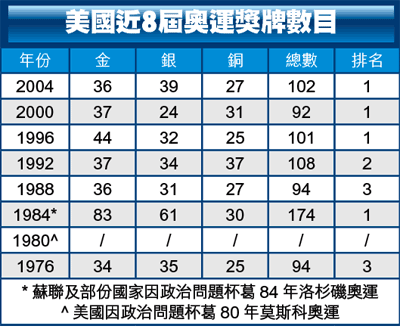 美國在對上3屆奧運會均穩佔「1哥」席位,不過金牌數目一屆比一屆少,而領先優勢亦逐屆收窄。96年亞特蘭大奧運她們得44金,比次席的俄羅斯多18金,但去到00年悉尼奧運「大縮水」,僅比「2哥」俄羅斯多5金;而去到04年雅典奧運她們優勢更進一步收窄,只比第2位的中國多4金。換言之,如她們想4連霸,於其「淘金地」游泳館就不容有失。