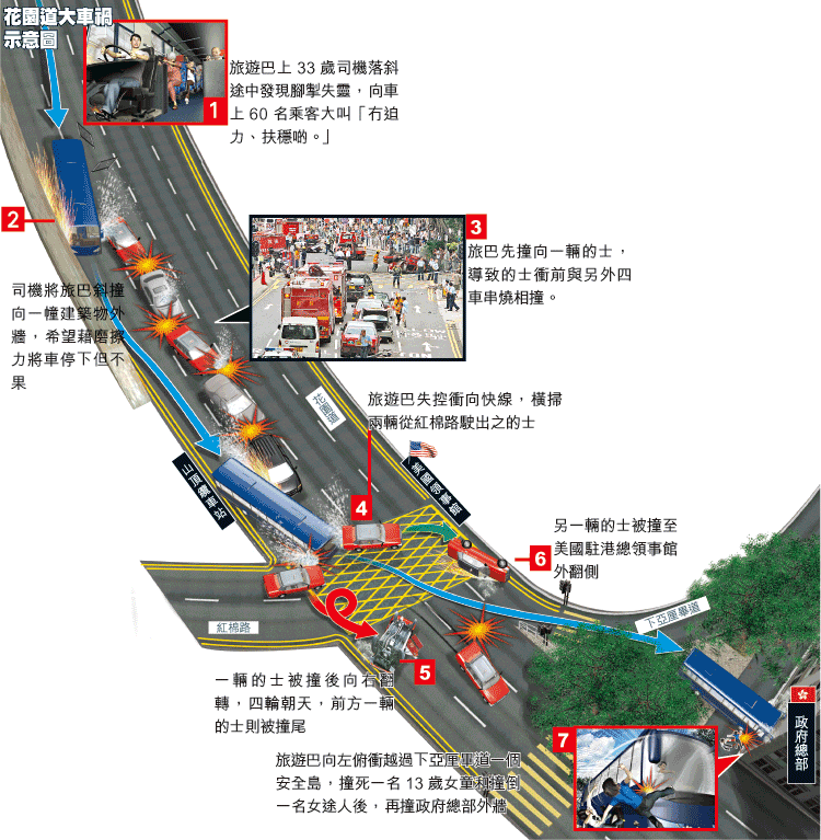 7)旅遊巴向左俯衝越過下亞厘畢道一個安全島,撞死一名13歲女童和撞倒一名女途人後,再撞政府總部外牆