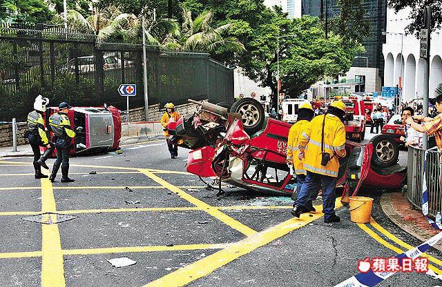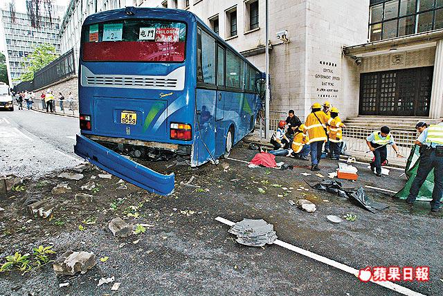 【本報訊】港島中區花園道昨日下午發生大車禍。載着屯門一個屋苑60名街坊的旅遊巴,落斜途中司機大喊「冇腳掣」,全車失控如過山車般俯衝,連撞八輛的士和私家車,繼而衝向下亞厘畢道,撞倒一名站在安全島的13歲女學生及一名女途人,直至撼向政府總部大樓外牆始停下,女童當場斃命。車禍中共32人受傷,其中兩人情況嚴重。 記者:鄭大康、卓永強