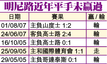 若球迷想玩「讓球」,足智彩開出平手盤則可一試彭美拉斯。皆因明尼路近季平手盤路甚差,近5場僅1走4輸(見附表),贏盤率0%之餘,輸盤率更高達80%,今客軍平手處高水位置,理值一博。