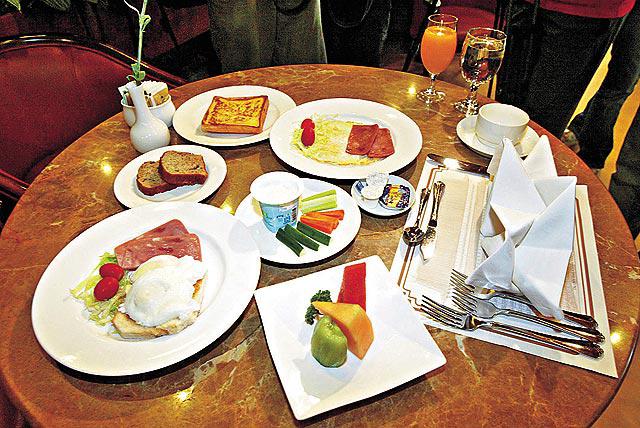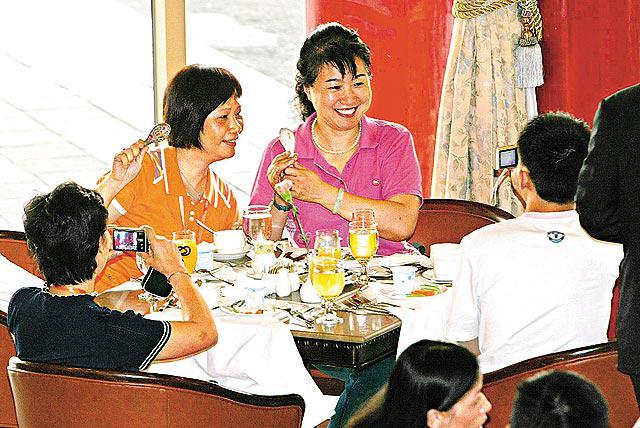 來自廣東的40多名團友,在10天9夜的行程中,雖無法親身體驗兩蔣文化,但昨早獲特別安排在圓山飯店品嚐經典的蔣夫人早午餐。不少女遊客品嚐後稱讚:「配搭健康,又好味,難怪蔣夫人可以長壽!」而該餐飲據悉是蔣宋美齡獨門養生餐飲。為重現這套經典餐飲,作為蔣介石及蔣宋美齡夫人御膳房的圓山飯店,除遍查典籍外,也特別諮詢了曾服侍蔣夫人餐飲的侍者,再加上嚴選的當季新鮮食材,終於成功再現美食精華。每份早餐盛惠140港元。