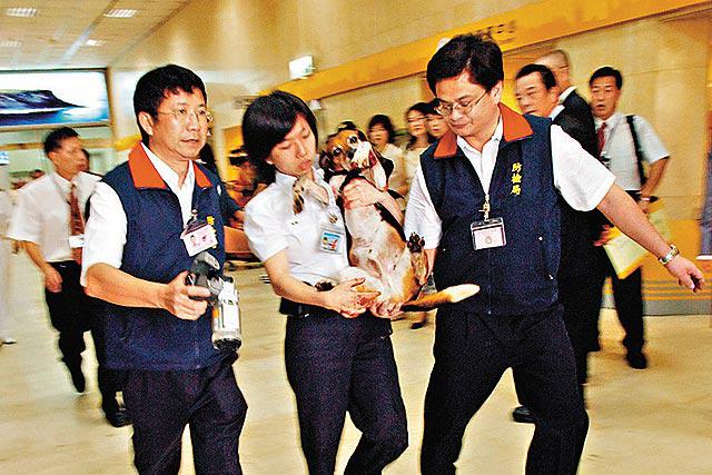 曾到美國受訓的檢疫犬DALTON,昨晨在台北松山機場值勤,在滾動中的行李轉盤上鑽來鑽去,嗅聞行李是否夾帶違禁品,結果因踩到舊行李轉盤的凹縫被夾傷腳,被迫退下火線,送往台大家畜醫院救治。而陸客被查出的違禁品包括金華火腿、生橄欖、新鮮玫瑰花等。