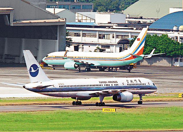 從廈門飛往台北的直航包機(前),昨日早上8時38分抵達台北松山機場,當客機滑向停機位時,機艙內109位福建赴台的旅客斷沒想到,他們竟與台灣的「空軍一號」總統座機(圖後)「擦肩而過」!這架由波音737-800改裝的台灣空軍一號,正式名稱應該叫「台總統府行政專機」,是當局耗資7,000萬美元,於1998年購買的。