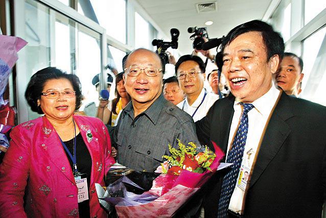 台中市長胡志強(中)和台中縣、彰化縣、南投縣政府及議會首腦率領的台灣中部首航訪問團,昨日從台中清泉崗機場起飛,前往廈門,昨晚並與廈門市委書記何立峰舉行會談。周末包機啓動前夕,台灣陸委會同意放寬縣市長赴大陸的限制,促成台灣首個縣市長訪問團登陸。