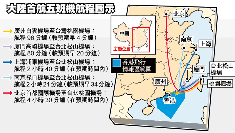 為緩解台商春節返鄉一票難求等困難,03年首次實施春節包機,但中途須停港澳,且只允台方單飛和單向載客,大陸航點僅上海。05年第二次包機實施,兩岸航空實現雙向對飛、載客,包機繞經香港飛行情報區,搭載對象限台商及眷屬,並增京和穗航點。06年春節,包機乘客擴大全台居民,並新增廈門航點。同年6月,包機擴大到清明、端午、中秋、春節四個傳統節日。