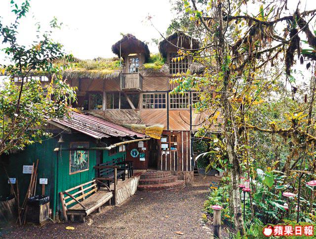 Bellavista保護區的建築物很有特色,主體是個用草木搭建的圓形塔樓,上窄下寬,地下是大家進餐的地方,一樓是雙人房間,再上是用垂直木梯相連接的二樓及三樓,提供床位住宿,塔樓外是工作人員的工作和起居所,鄰近還有些零星散佈的獨立小屋。今次我選擇床位住宿,頂層宿位四邊圍繞着玻璃窗,有露台,有無敵雲霧林美景,更可不時看到雀鳥在簷前飛舞,更幸運的是,這夜由於沒有其他床位住宿的人客,可佔據全部12個床位。