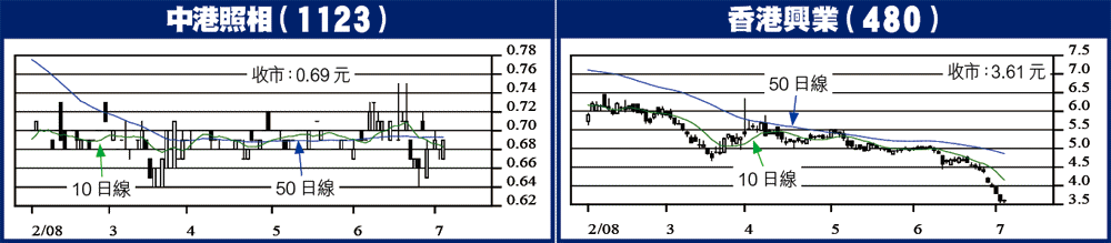 香港興業(480)對上10個交易日,清一色陰燭,兼跌咗近25%,日線圖嘅14RSI跌到得番13,嚴重超賣,博轉短打。香港興業08年度(3月底止)純利雖則倒退兩成,到9.24億銀,但股價咁插法,PE跌到得番5倍。再講,集團最新NAV7.5元,現價(3.6元)折讓上到52%,有折讓墊底之餘,相對市值晒士近磅嘅地產股當中,興業夠晒吸引。呢轉博興業超賣反彈,以20%升幅計,價見4.32元,到時,興業嘅NAV折讓仲講緊有42%。