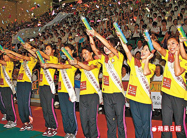保良局為了慶祝130周年及迎接下月奧運,推廣健康生活教育,昨日在灣仔修頓室內運動場舉行「萬人健康操」,11位候選香港小姐應邀出席啓動儀式。眾佳麗參與萬人健康操,表現興奮。