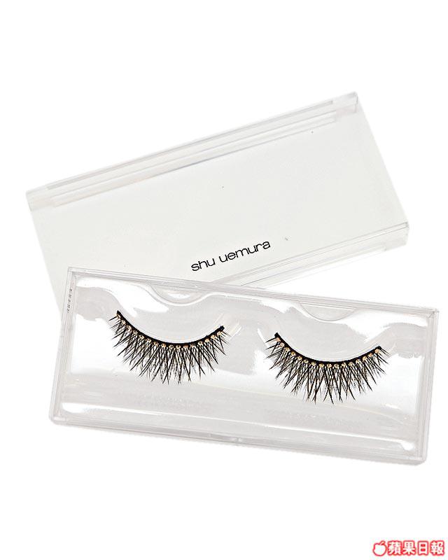 3. 用睫毛專用箝夾住假睫毛,塗上膠水,先黏上排,再到下排,由於這排假睫毛較重,黏時要稍離下眼瞼。最後,以深色胭脂從顴骨開始往後掃作陰影,再在笑肌加上淺色胭脂令面形立體,再塗上裸色唇膏即成。