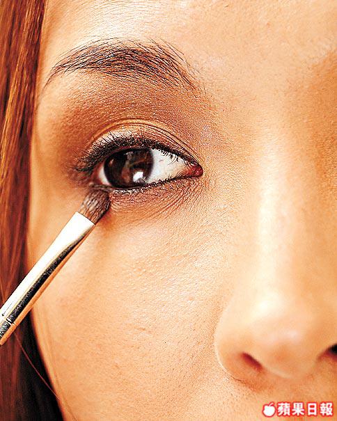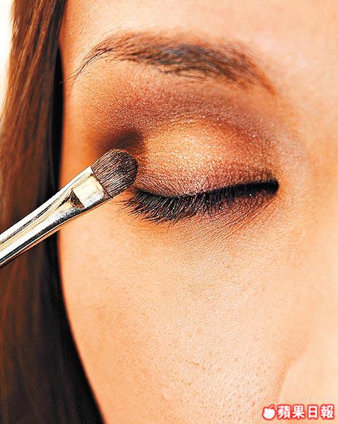 1. 深啡色眼影塗在眼窩邊下陷範圍,將顏色暈開,再加在雙眼皮位,特別加強眼尾,跟眼窩尾連接起。以紅金色加在眼窩位作光影。