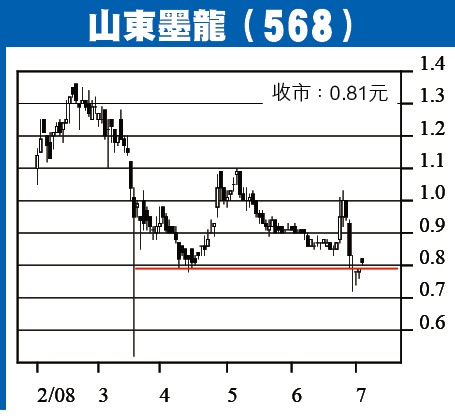 山東墨龍股價由6月底時的1.03元大跌逾兩成,最低見0.72元,近日反彈,上周五升2.5%,收報0.81元,重返支持軌之上。