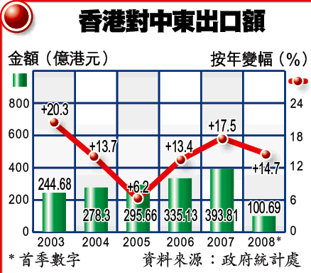 【本報訊】歐美傳統市場經濟疲弱,港府及商界近年均積極拓展新興市場,尤其是受惠於油價高漲的中東產油國。如本地銀行去年底便推出了伊斯蘭基金,吸引油錢來港投資;本港建造業則更早登陸中東,參與當地基礎建設。貿發局表示,香港與中東的貿易往來,今年首季仍繼續以雙位數字增長。 記者:周燕芬
