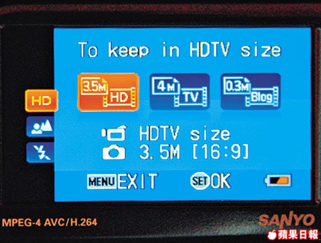 HD1010作為Sanyo旗艦級攝錄機,當然係全面支援高清規格攝錄,解像度基本已達到FullHD1,920×1,080,支援1080i/p,影片格式用MPEG4AVC/H.264作編碼,兼容性高。攝錄時更將畫面傳送速度提高至14Mb/s,令到畫面有更多嘢睇,對比度明顯有所提高,亦比一般攝錄機畫面細緻。隨機身設有底座,介面包括有HDMI,可以直接將高清畫面輸出至電視上欣賞。HD1010仍然支援一邊攝錄一邊影相玩法,透過插值,最高可以拍攝800萬像素相片,亦提供有12張人臉追蹤功能。