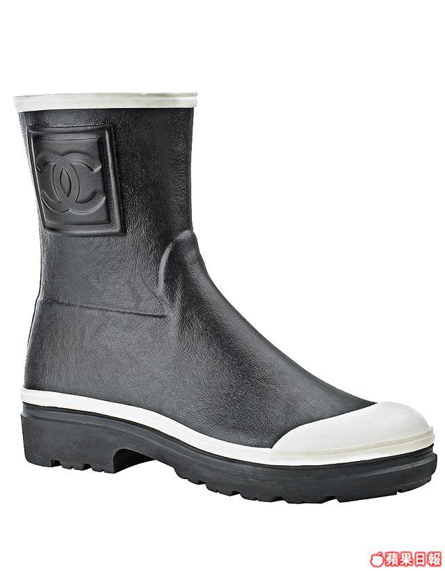 貴婦風格的Chanel都唔輸蝕,雖只推出一款短boot,但亦絕不是係咁意趁墟之作。Karl爺發功,唔玩多色,但就大賣Chanel小姐的傳奇生活故事,以Chanel小姐和西敏公爵於1920年代在蘇格蘭河岸釣三文魚的故事做設計靈感,膠水靴是系列的其中一個item,低筒設計,黑色壓紋logo配白色邊,重現Chanel小姐當年的濕水運動look,貴氣依然。