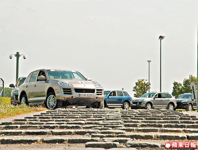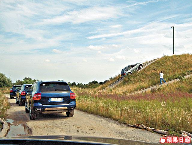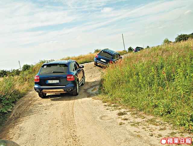 Porsche於廠方另一邊開闢咗一大片草原愛嚟玩Off-road,超過百畝草原上只有6公里做車道,遠望有如走進南非草原玩safari。大家全程以CayenneS測試,每部配有Off-roadPackage,包括氣壓懸掛系統、電子加力箱、電子輔助系統、雙差速器鎖定等,走進呢個佈滿沙石凹凸不平嘅路段、深淺不一嘅水氹泥沼、唔同斜道嘅窄道等等,乜嘢惡劣Off-road都玩齊。