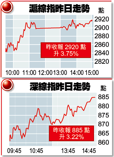 滬綜指高收2920點,升105點或3.75%;深綜指則報885點,升27點或3.22%,兩市成交額升19.31%至1578.92億元(人民幣.下同)。