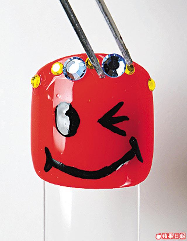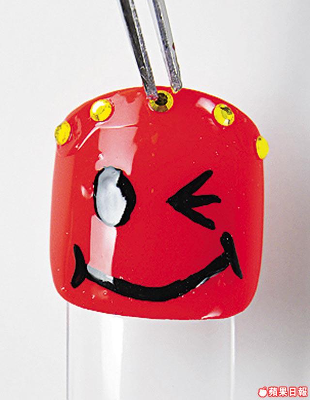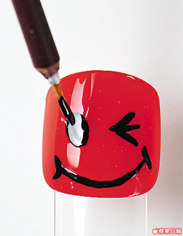 1.上底油,先在整隻甲塗最少兩層橙色甲油。再用幼顏料筆沾黑色甲油,畫上單眼SmilyFace。