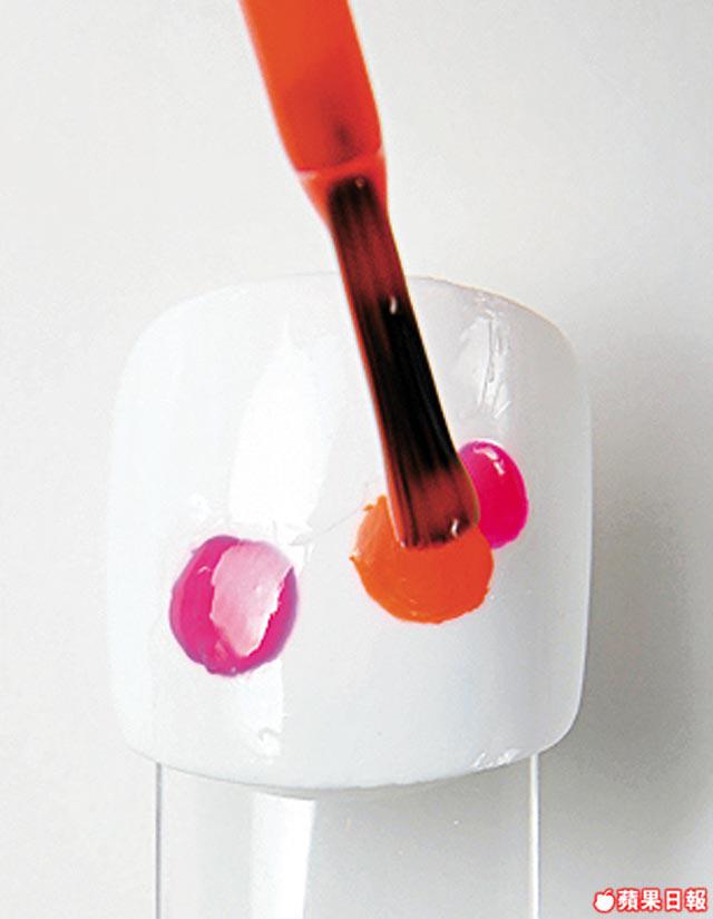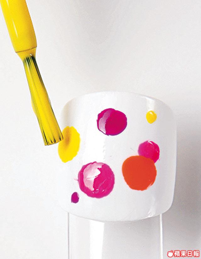 1.先在整隻腳甲塗上最少兩層白色甲油,然後用螢光粉紅甲油滴上大細波點,再滴螢光橙波點,波點可以重叠。