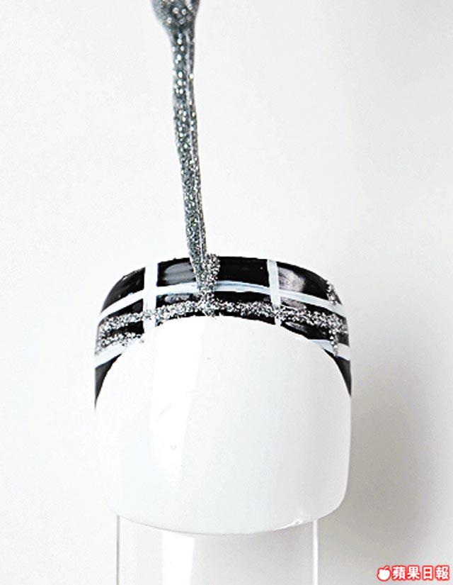 2.隨意在法式邊上畫幼白邊。最後再在法式邊上隨意加上銀線,並髹上面油。