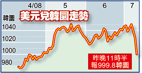 【本報綜合報道】南韓政府干預滙市的行動繼續升級,昨再度入市托高貨幣,並藉允許國企進行海外貸款來增加韓圜需求,韓圜昨在政府力托下,升至2個月高位,美元兌韓圜更一度跌穿1000的心理關口。