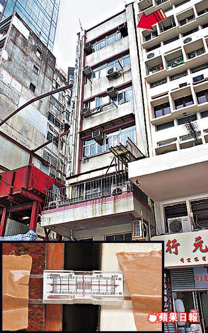 【本報訊】屋宇署工程人員昨日檢查過西環「斜樓」後,認為這幢近40年樓齡的六層高舊樓,是因為相連地盤施工破壞地基,引致大廈傾斜和出現裂痕,但沒有即時倒塌危險,並非「危樓」,在進行加固工程後住客可以重新入住。屋宇署在大廈外貼上法庭封樓令,直至有關加固工程完成為止,但受影響住客則對大廈結構沒有信心,有住客說:「打死我都唔會返嚟住㗎!」